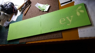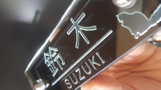 彫刻のこと看板の作製 いつもより大きめの、看板を作製中です。 材料支給なので、失敗しないように、かなり慎重です。 1ヶ所、継ぎ目の段差が彫る文字に掛かっているので、心配です。 やってみないと分からないので、やるしかないです。 良く光って綺麗です。 2017.08.11彫刻のこと