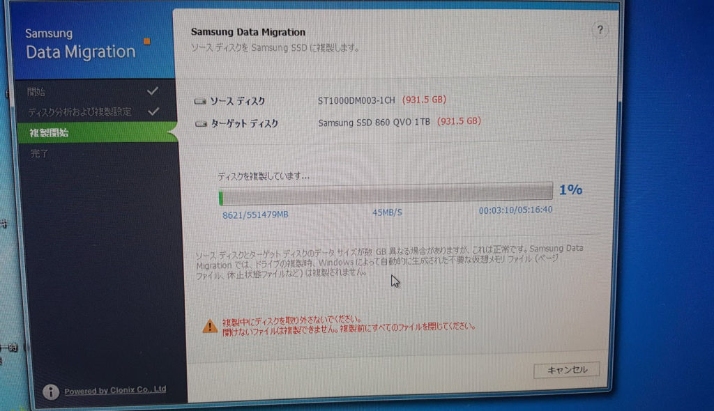 まずは、前回同様にHDDのクローンをSSDに作製します。